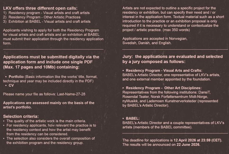 Lademoen Kunstnerverksteder is pleased to announce the open calls for the Artist-in-Residence program and for exhibition at BABEL for 2027–2028, and invites all professional artists to apply. Please read the information about the different application forms available carefully before starting your application. We welcome artists from all over the world to apply. Design by: Joana Bruno