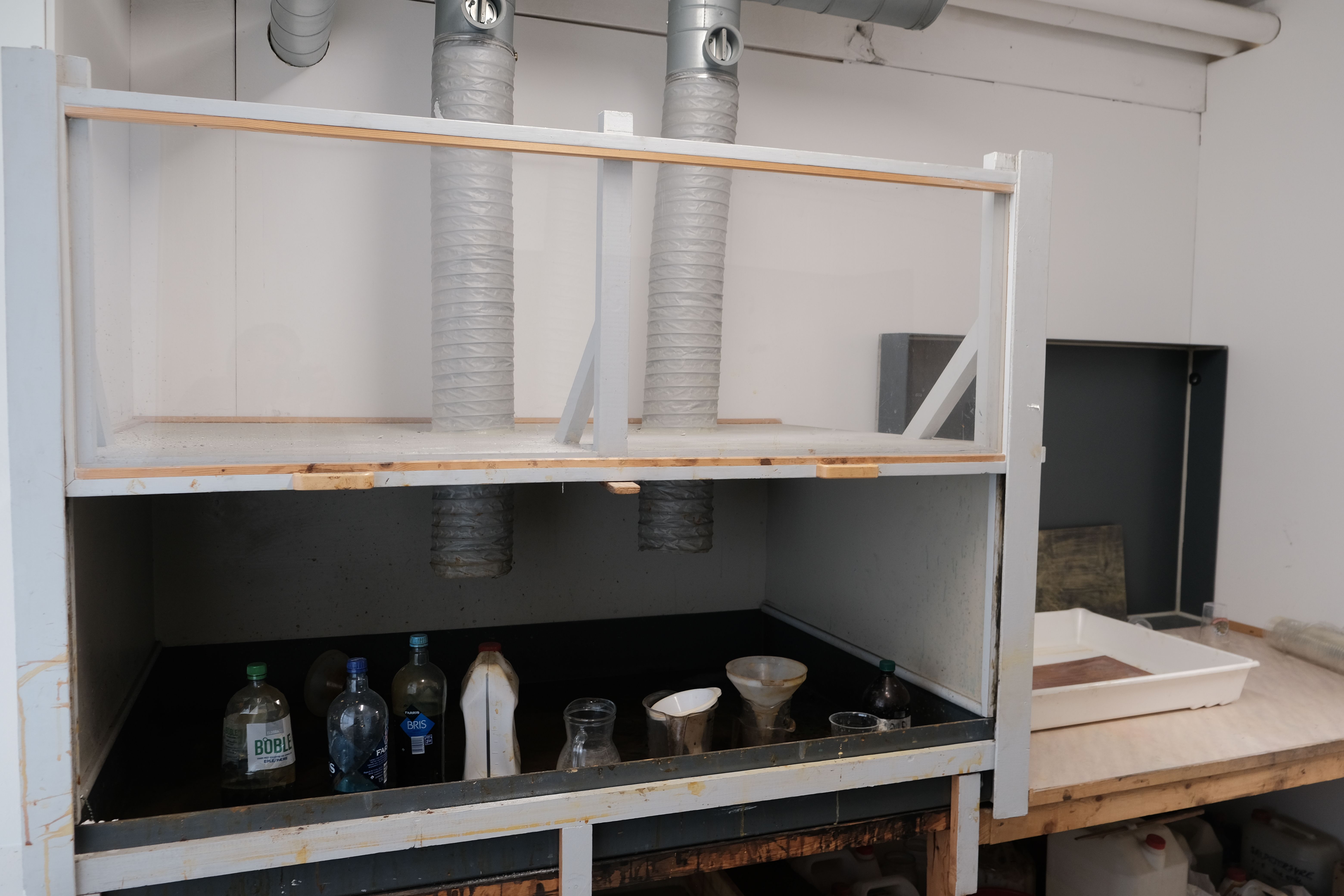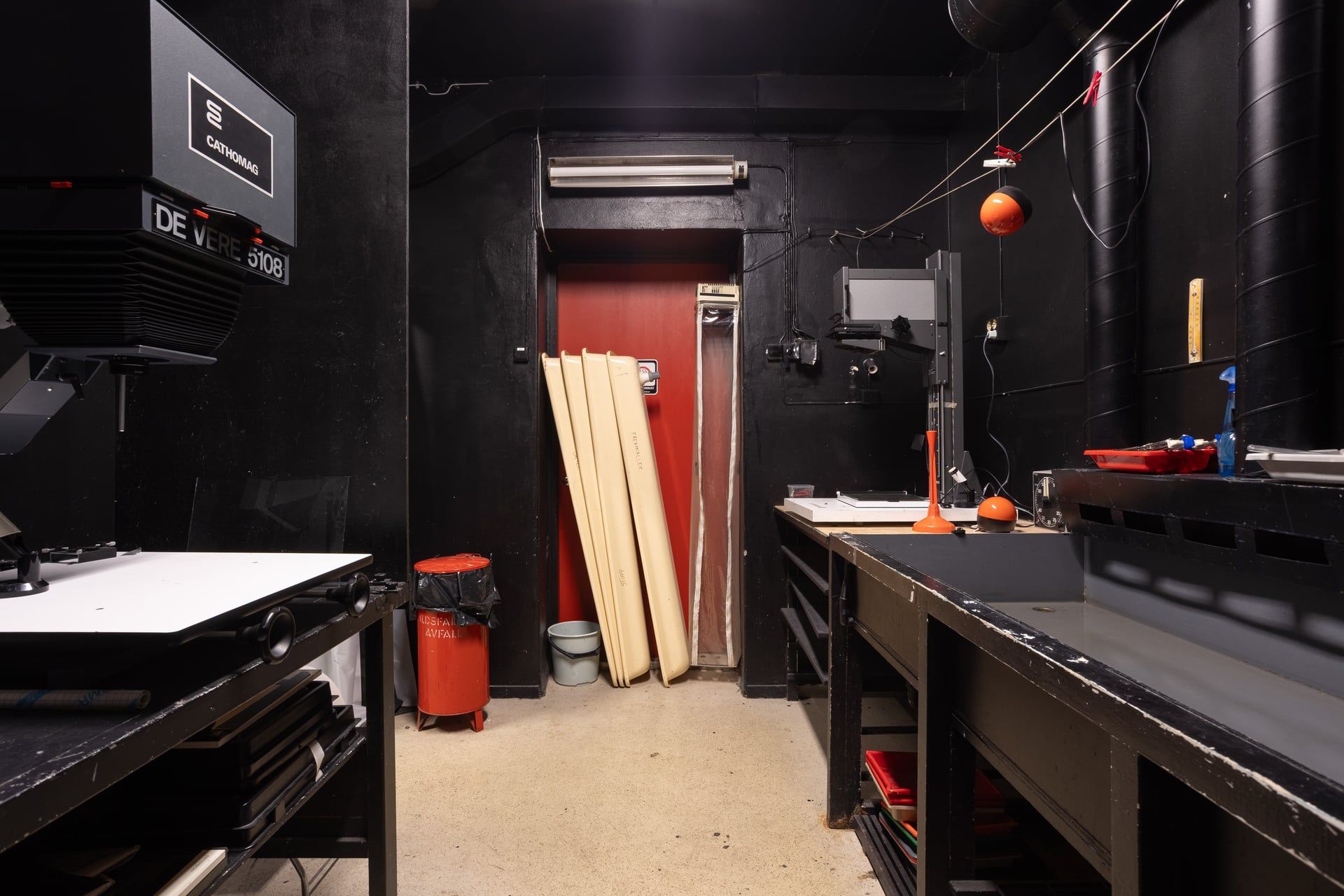 A darkroom and workspace for analog photography and photo-based processes — ideal for developing film, printing, and experimenting with photographic techniques.