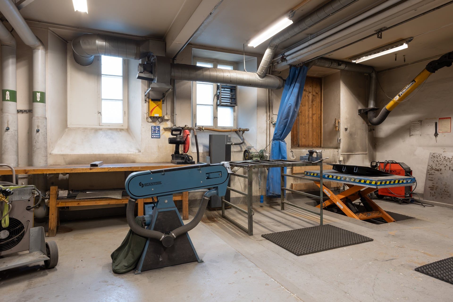 A well-ventilated indoor workshop for heavy-duty production, equipped for welding, grinding, drilling, and casting. Includes a 15 m² room for stone or mold work.