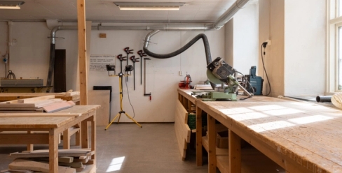 A shared wood workshop equipped for cutting, shaping, and assembling — suited for everything from sculpture to framing and construction.