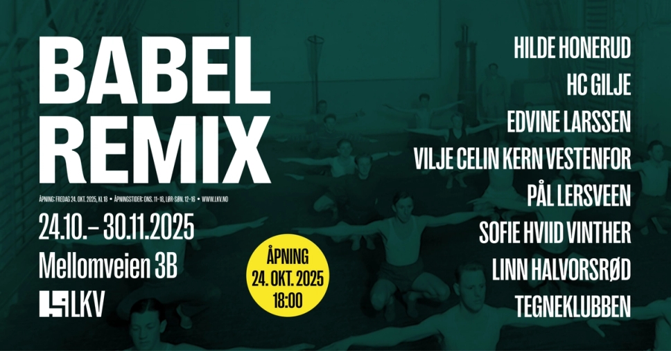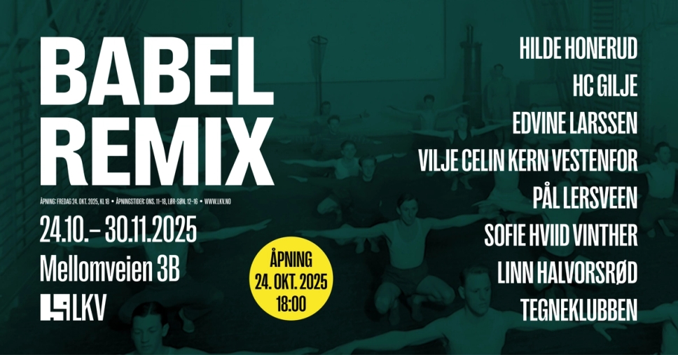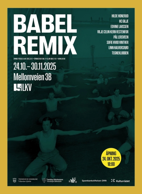 BABEL REMIX er den aller første utstillingen i det nye visningsrommet, og viser arbeider av Hilde Honerud, HC Gilje, Edvine Larssen, Vilje Celin Kern Vestenfor, Pål Lersveen, Sofie Hviid Vinther, Linn Halvorsrød og Tegneklubben (Bjørn Bjarre, Ulf Verner Carlsson, Paul Dring, Terje Nicolaisen og Martin Skauen).