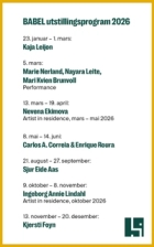 BABEL er LKVs visningsrom for samtidskunst. Vi presenterer både etablerte og nye kunstnere, lokalt og internasjonalt. Målet er å skape en dynamisk plattform for kunstnerisk uttrykk og publikumsengasjement.