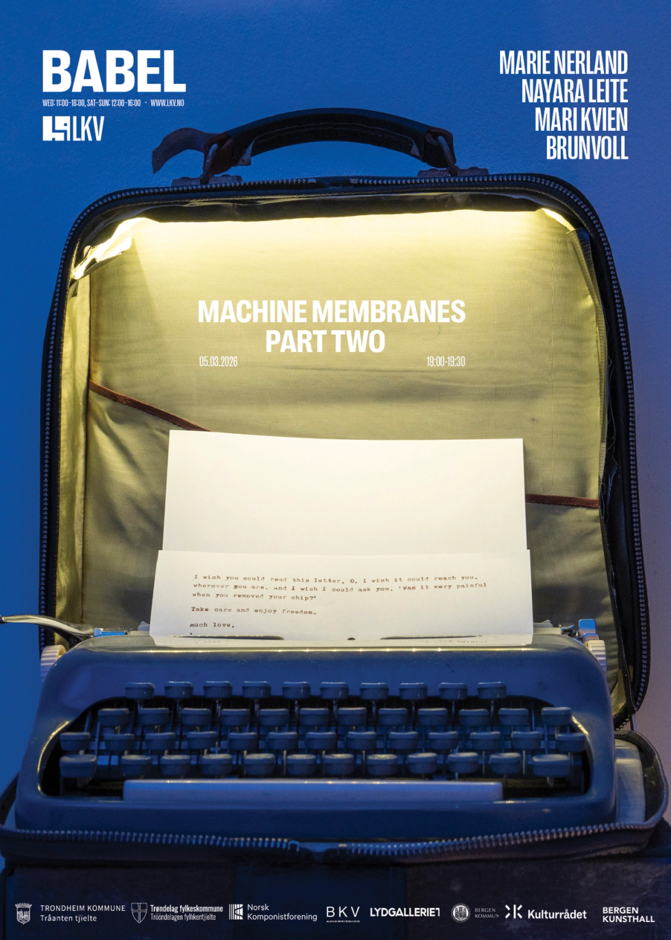 Machine Membranes – Part Two er støttet av Bergen kommune, Billedkunstnernes Vederlagsfond (BKV) og Norsk Komponistforening. Deler av materialet ble utviklet på Live Studio hos Bergen Kunsthall i 2024.