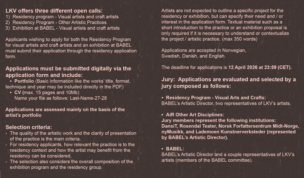 Lademoen Kunstnerverksteder is pleased to announce the open calls for the Artist-in-Residence program and for exhibition at BABEL for 2027–2028, and invites all professional artists to apply. Please read the information about the different application forms available carefully before starting your application. Design by: Joana Bruno